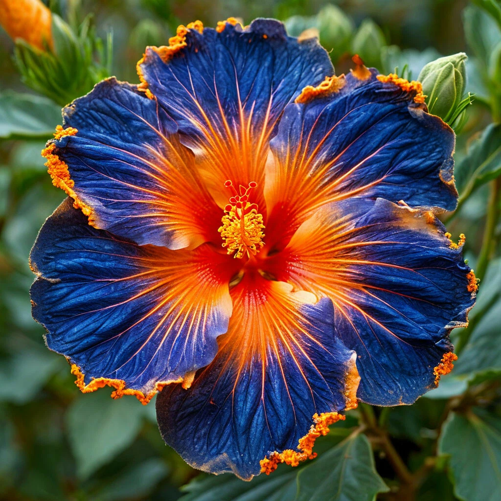 - Синий цвет с оранжевой серединой: главная особенность этого сорта — его уникальная и привлекательная окраска. Цветки гибискуса “Истэн Клауд” обладают редким синим цветом лепестков . Яркая оранжевая середина добавляет цветку тепла и привлекательности, создавая эффект внутреннего свечения.