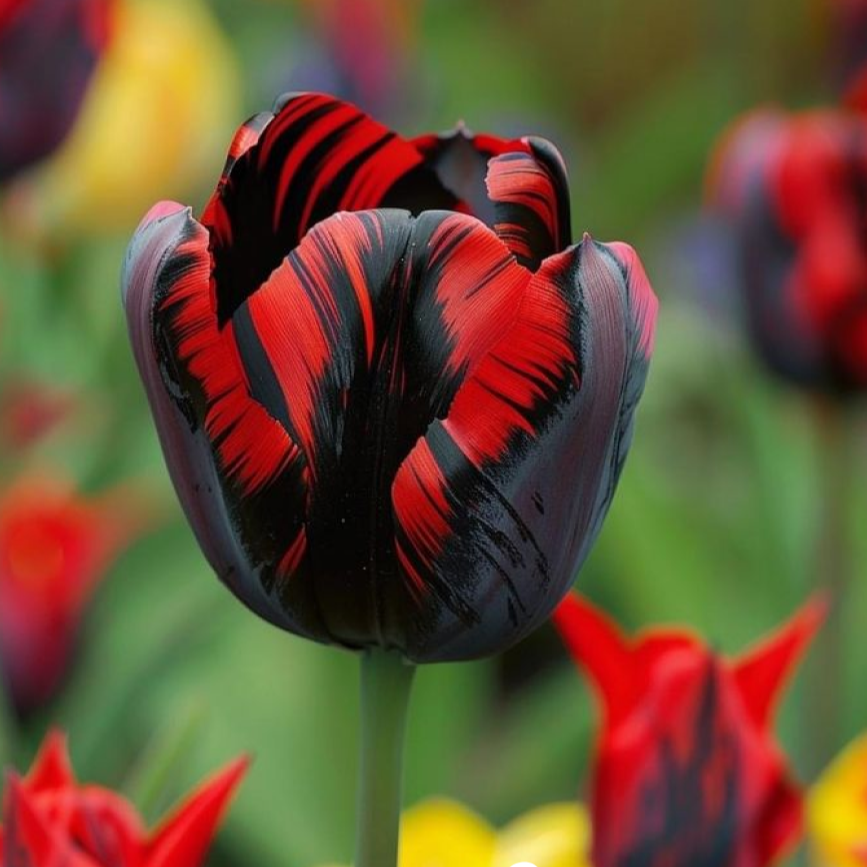 Тюльпан «Блэк Перрот» – это настоящая жемчужина среди тюльпанов, которая поражает своей необычной красотой и изысканностью. Этот сорт относится к группе попугайных тюльпанов, известных своими причудливыми формами и яркими расцветками. «Блэк Перрот» выделяется глубоким черным цветом с бархатистыми переливами и красными акцентами, что делает его одним из самых эффектных и запоминающихся сортов.